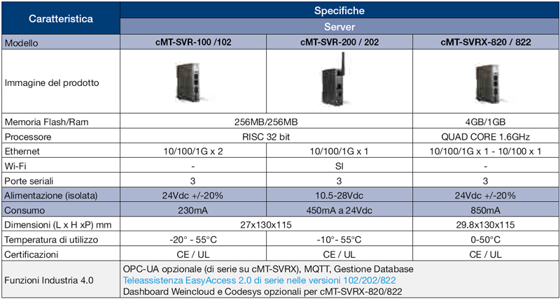 La gamma prevede dispositivi con display integrato (cMT 2008X / 3000X) e possibilità di Soft PLC Codesys, moduli I/O remoti (cMT-iR), Gateways Industria 4.0 (cMT-G0x), moduli ciechi con uscita video full HD (cMT-FHDX) per un’offerta vasta e articolata capace di rispondere a qualsiasi esigenza in ottica 4.0
